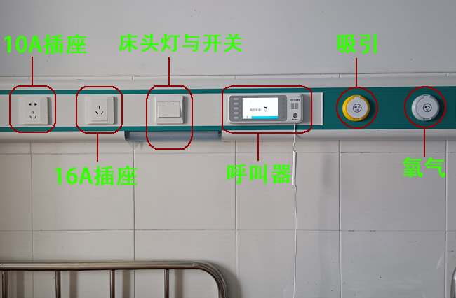 醫(yī)院普通病房床頭醫(yī)用設(shè)備帶上的設(shè)備,根據(jù)不同檔次及科室病房的具體需求一般會(huì)安裝:中心供氧系統(tǒng)氧氣、真空負(fù)壓、壓縮空氣、呼叫器分機(jī)、插座、照明、網(wǎng)絡(luò)口等醫(yī)用氣體和醫(yī)護(hù)輔助設(shè)備。